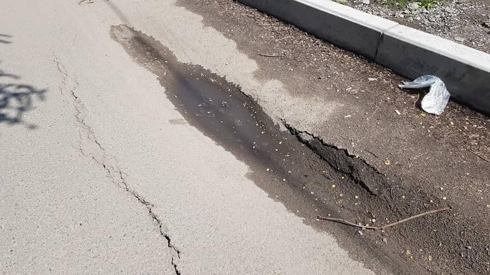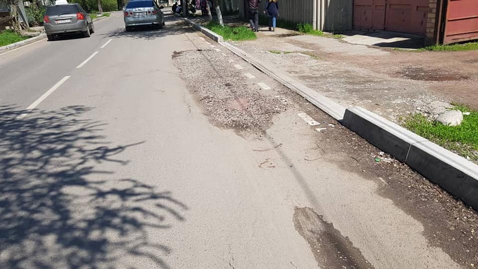 В Бишкеке еще на одной отремонтированной улице провалился асфальт. Об этом в социальной сети Facebook написал пользователь Манас Кадыров.