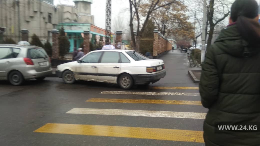 На пешеходном переходе напротив Орто-Сайского рынка на улице Жукеева-Пудовкина людям приходилось перепрыгивать через скользские арыки из-за машин на разметке.