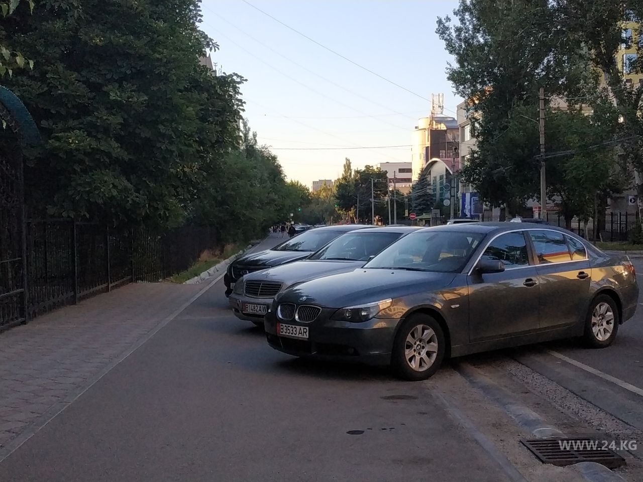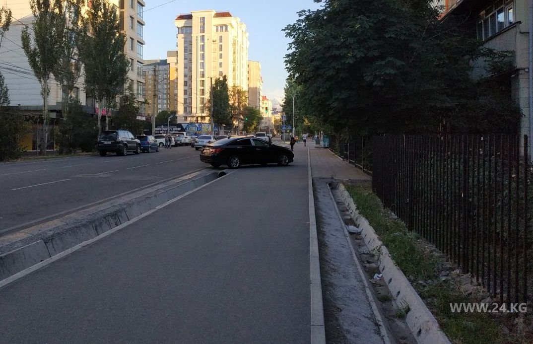 На тротуар заехали сразу несколько машин на пересечении улиц Исанова и Токтогула.