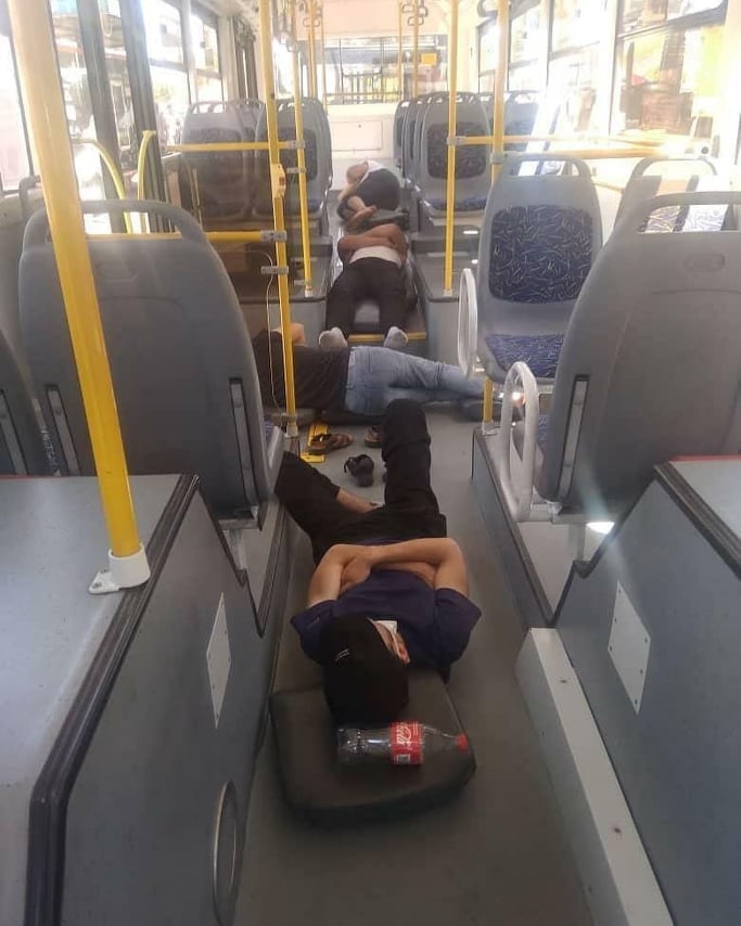 Водители общественного транспорта спят в автобусах, потому что не могут попасть домой после смены. Фотографию с таким описанием распространяют в социальных сетях.