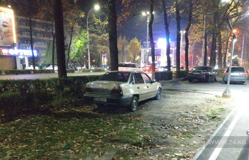 На проспекте Манаса машину оставили на газоне. Ранее читатели сообщили, что на этом же месте автомобили паркуют на велодорожке.