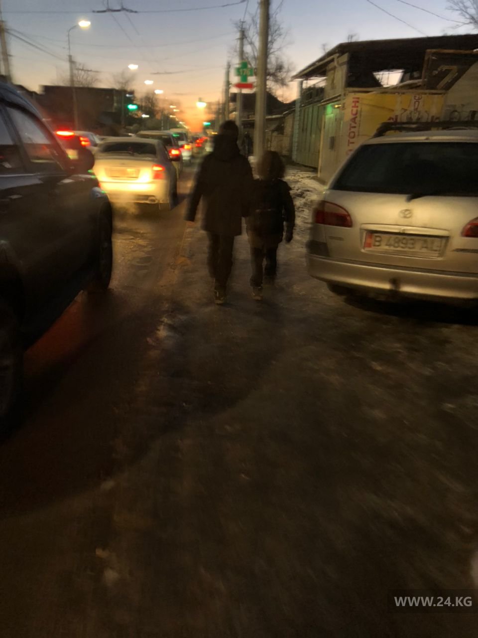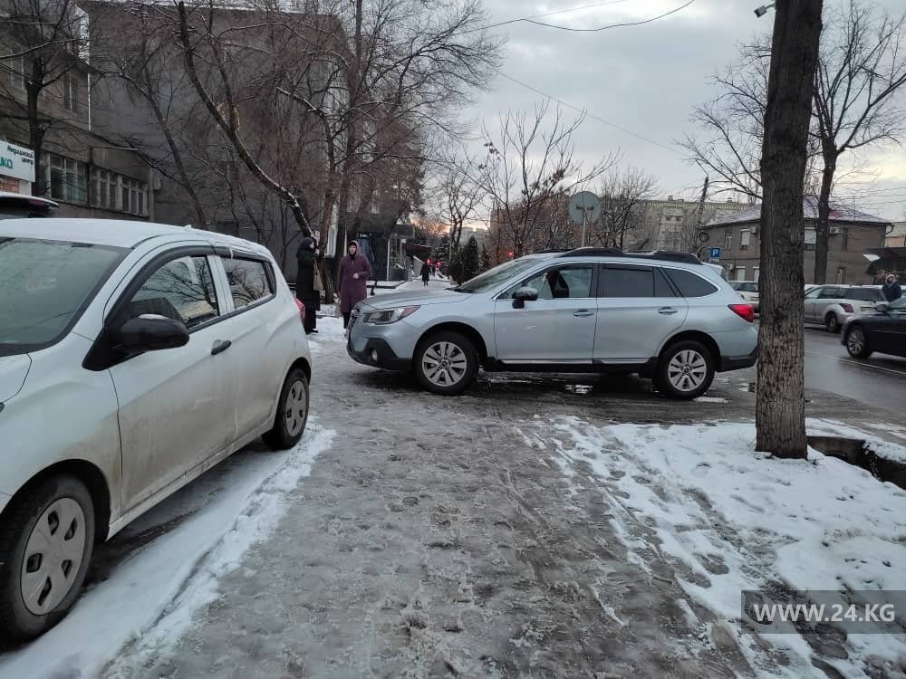 Бишкекчане продолжают жаловаться на машины на тротуарах. Так припарковались на улице Токтогула.
