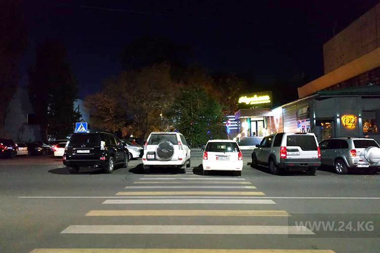 На улице Тыныстанова пешеходный переход занят машинами клиентов кафе, расположенных в здании Русского драмтеатра.