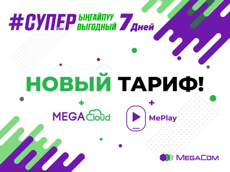 - #Супервыгодный 7 — это10 ГБ интернета на максимальной скорости, 500 минут, 500 SMS внутри сети и пять минут на другие сети всего за 115 сомов за семь дней. Пакет также предусматривает просмотр 50 каналов мобильного телевидения в сервисе MePlay и доступ к облачному хранилищу MegaCloud для загрузки и хранения файлов общим объемом до 15 ГБ в приложении Mega24.