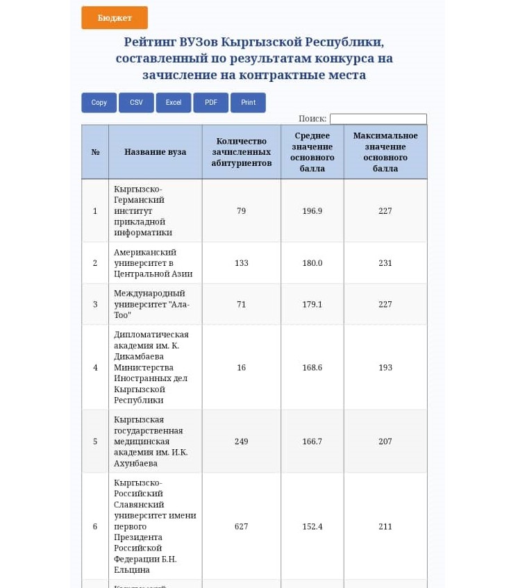 В тройку лидеров вошли также Американский университет в Центральной Азии и Международный университет «Ала-Тоо».