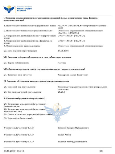Потому что по базе Минюста учредителями ОсОО «ТАНСУ», кроме Закерья Тахирова, все еще значатся Билал Ахмед и Махмуд Билалов, а гендиректором — уволенный еще в 2022 году Марат Ханмурзин.
