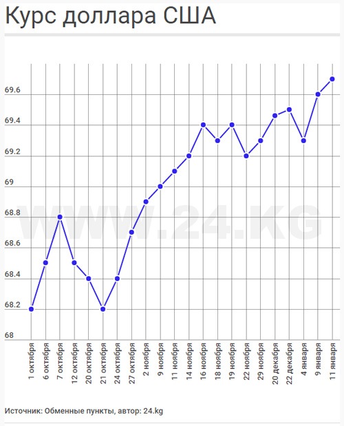 Пока интервенция существенных результатов не дала. Курс доллара держится на высокой отметке. Сегодня обменные пункты столицы и коммерческие банки покупают доллар по 69,4-69,5 сома, продают по 69,7-69,75 сома. Номинальный курс - 69,4953 сома (рост за сутки на 0,01 процента).