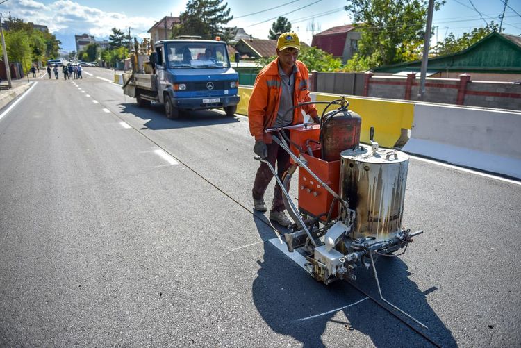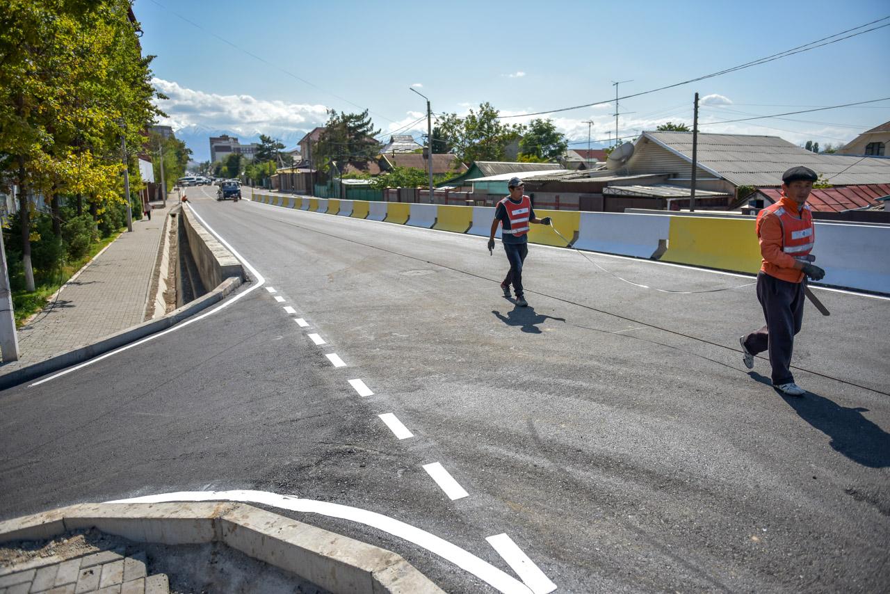 По ее данным, уже полностью уложено асфальтобетонное покрытие — как на проезжей части, так и на тротуарах. Сейчас наносят дорожную разметку и устанавливают дорожные знаки, регулирующие движение на повороте с улицы Токтоналиева на улицу Медерова.