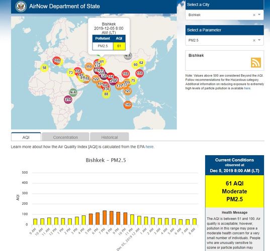 Посольство США в Кыргызстане также установило датчик. Он показывает индекс качества воздуха в режиме онлайн. Информация обновляется ежечасно.
