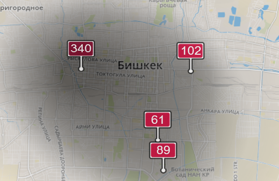 - в районе улиц Бейшеналиевой/Токтогула. Уровень загрязнения превышен в 6,11 раза: PM2.5 среднесуточный — 214 мкг/м³, на момент измерения — 340 мкг/м³;