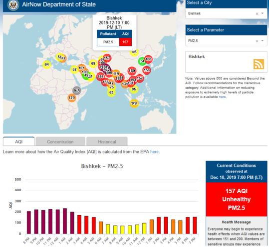 Посольство США в Кыргызстане также установило датчик. Он показывает индекс качества воздуха в режиме онлайн. Информация обновляется ежечасно.