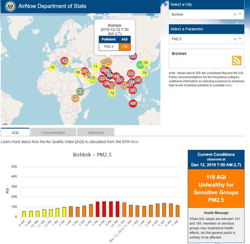 Посольство США в Кыргызстане также установило датчик. Он показывает индекс качества воздуха в режиме онлайн. Информация обновляется ежечасно.
