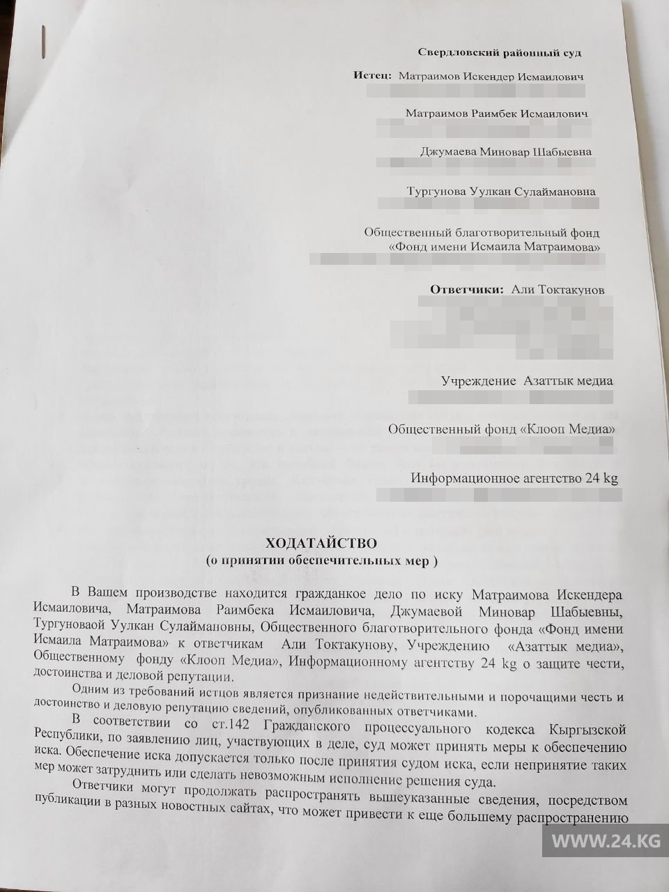 В Свердловском районном суде Бишкека начались предварительные слушания по иску семьи Матраимовых против трех СМИ — 24-kg.com, Kloop и «Азаттыка» и журналиста Али Токтакунова. Председательствует на процессе судья Жылдыз Ибраимова.