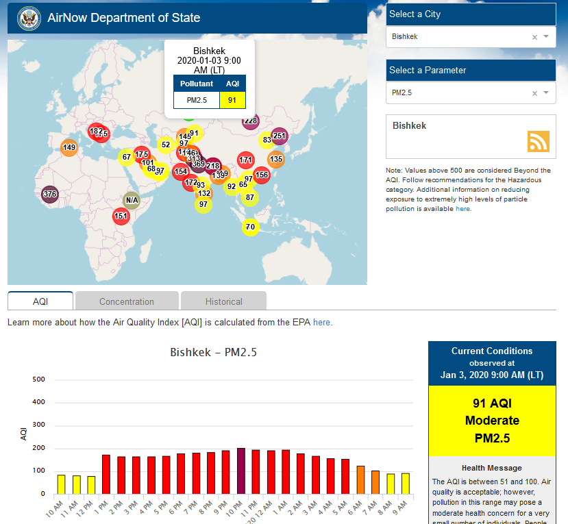 Посольство США в Кыргызстане также установило датчик. Он показывает индекс качества воздуха в режиме онлайн. Информация обновляется ежечасно.