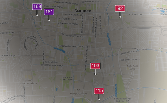 - в районе улиц Бейшеналиевой/Токтогула. Уровень загрязнения превышен в 7,11 раза: PM2.5 среднесуточный — 249 мкг/м³, на момент измерения — 168 мкг/м³;