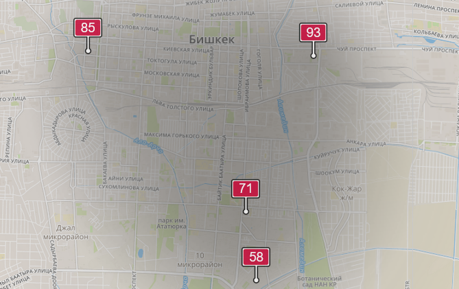 - в районе улиц Бейшеналиевой/Токтогула. Уровень загрязнения превышен в четыре раза: PM2.5 среднесуточный — 142 мкг/м³, на момент измерения — 85 мкг/м³;