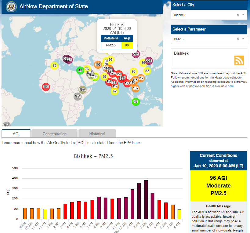 Посольство США в Кыргызстане также установило датчик. Он показывает индекс качества воздуха в режиме онлайн. Информация обновляется ежечасно.