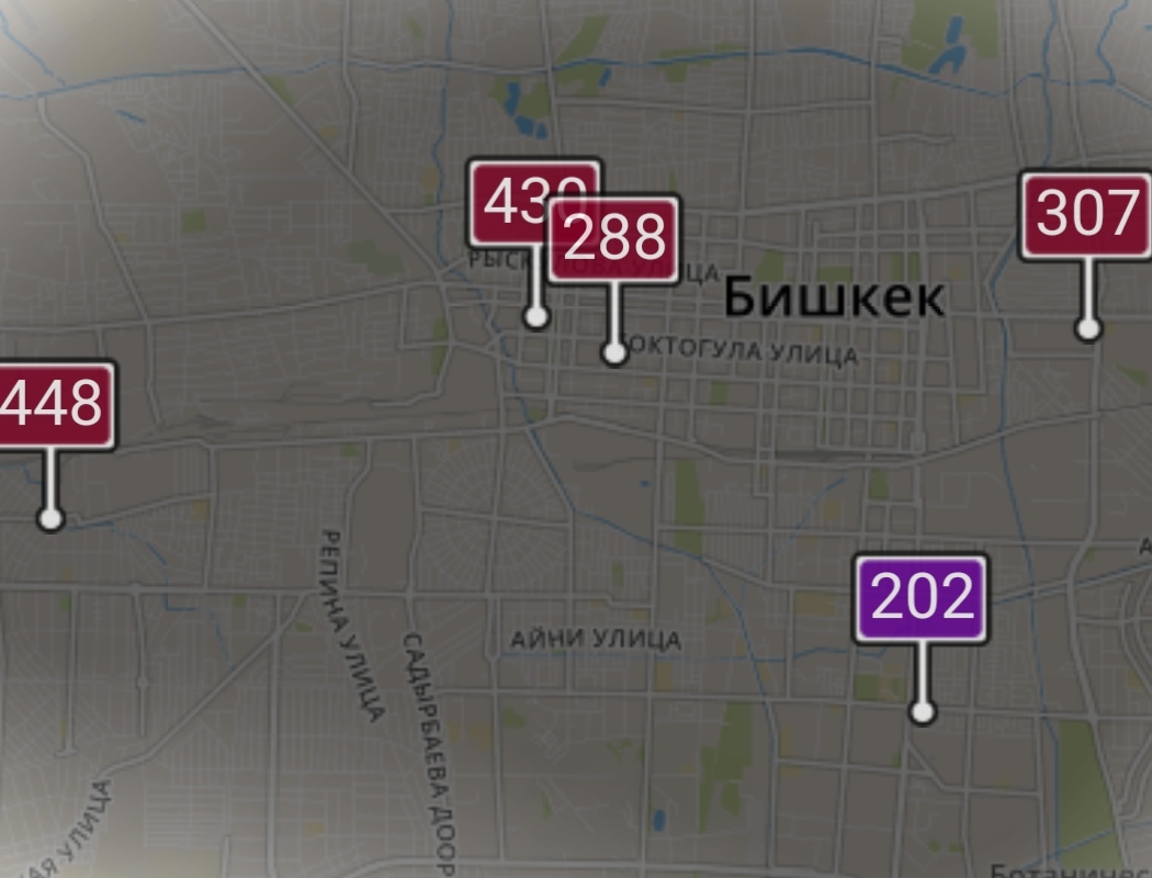- жилмассив «Ак-Орго». Уровень загрязнения превышен в 10,6 раза: PM2.5 среднесуточный — 370 мкг/м³, на момент измерения — 448 мкг/м³;