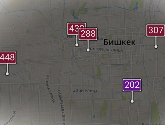 - в районе улиц Бейшеналиевой/Токтогула. Уровень загрязнения превышен в 5,37 раза: PM2.5 среднесуточный — 188 мкг/м³, на момент измерения — 430 мкг/м³;