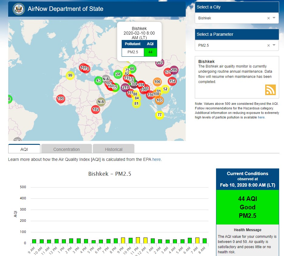 Посольство США в Кыргызстане также установило датчик. Он показывает индекс качества воздуха в режиме онлайн. Информация обновляется ежечасно.
