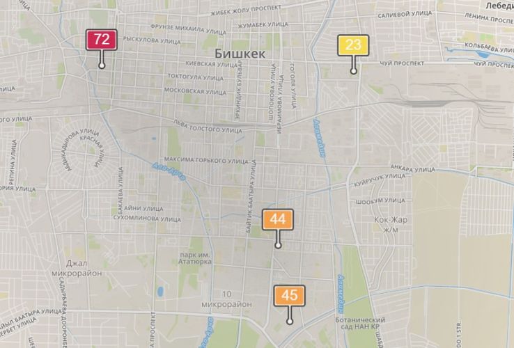 - в районе улиц Бейшеналиевой/Токтогула. Уровень загрязнения не превышен: PM2.5 среднесуточный — 33 мкг/м³, на момент измерения — 72 мкг/м³;