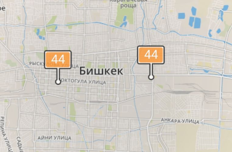 - в районе улиц Московской/Уметалиева. Уровень загрязнения превышен в 1,26 раза: PM2.5 среднесуточный — 44 мкг/м³, на момент измерения — 44 мкг/м³;