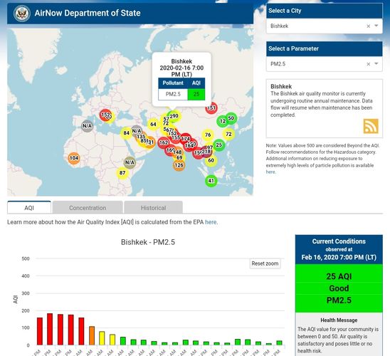 Посольство США в Кыргызстане также установило датчик. Он показывает индекс качества воздуха в режиме онлайн.