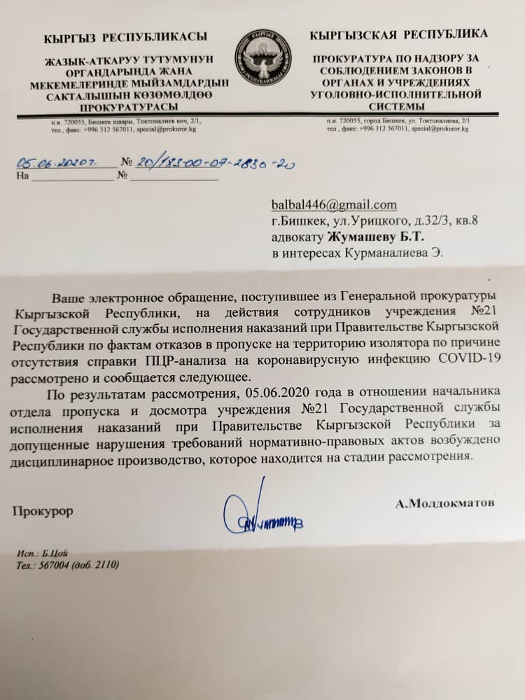 «Из надзорного органа пришел ответ, что в отношении начальника отдела пропуска и досмотра возбудили дисциплинарное производство. Он допустил нарушения требований нормативно-правовых актов», — сказал Бактыбек Жумашев.