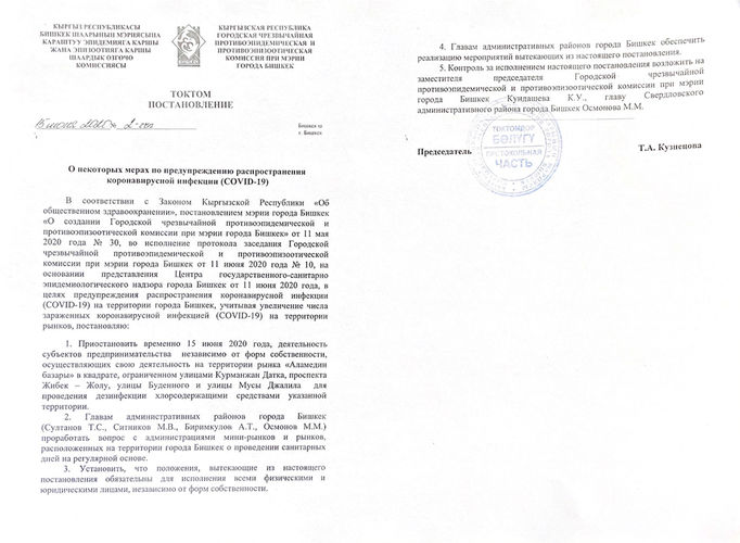 По ее данным, постановление подписала вице-мэр столицы, глава городской чрезвычайной противоэпидемической и противоэпизоотической комиссии Татьяна Кузнецова.