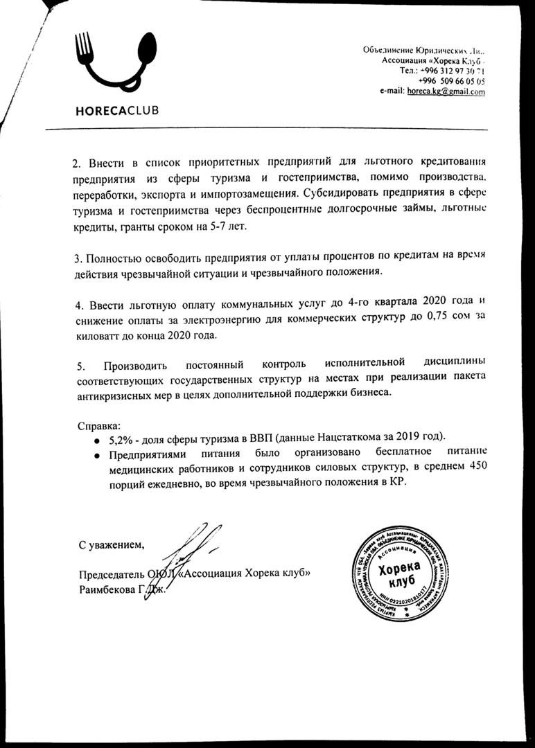 Кроме того, рестораторы просят внедрить программу льготного кредитования субъектов предпринимательства.