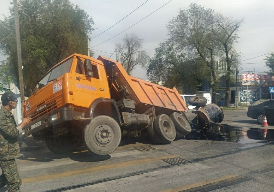 На улице Толстого КамАЗ Бишкекасфальтсервиса провалился колесом в арык. Фотографии выложили в группе «Черный список — нам не понравилось».