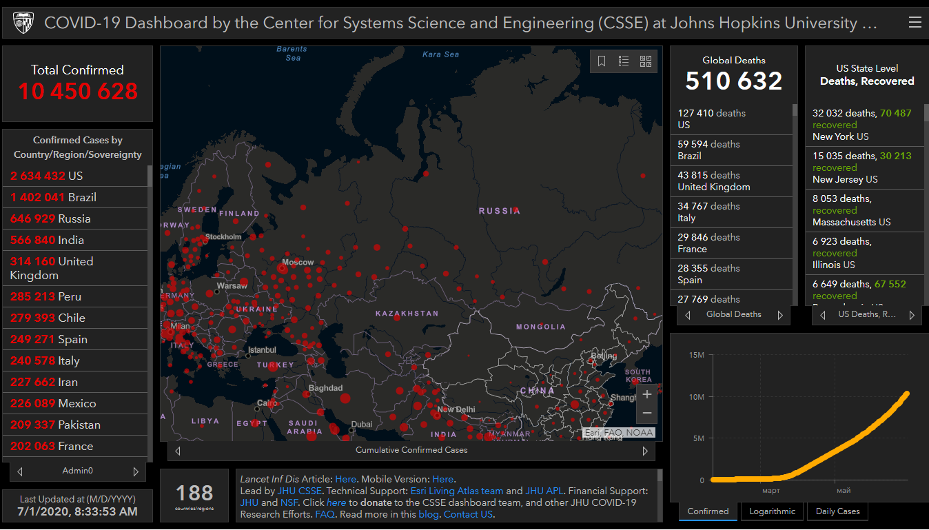 Всего в мире коронавирусом заразились 10 миллионов 450 тысяч 628 человек. Больше всего зараженных в США (2 миллиона 634 тысячи 432), Бразилии (1 миллион 402 тысячи 41), России (646 тысяч 929), Индии (566 тысяч 840), Великобритании (314 тысяч 160), Перу (285 тысяч 213) и Чили (279 тысяч 393).