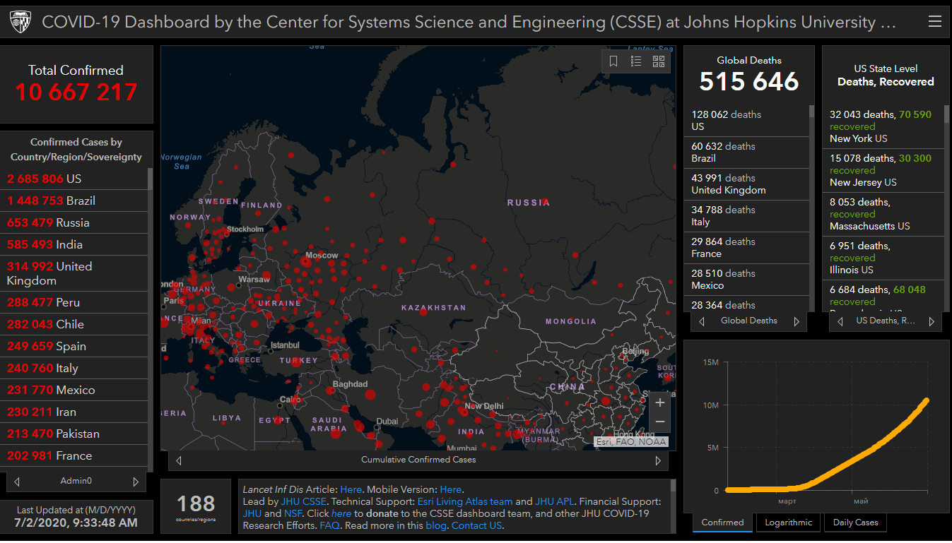 Всего в мире коронавирусом заразились 10 миллионов 667 тысяч 217 человек. Больше всего зараженных в США (2 миллиона 685 тысяч 806), Бразилии (1 миллион 448 тысяч 753), России (653 тысячи 479), Индии (585 тысяч 493), Великобритании (314 тысяч 992), Перу (288 тысяч 477) и Чили (282 тысячи 43).