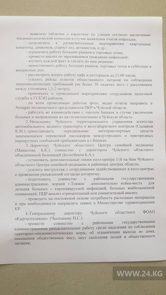По его данным, запрещена работа маршруток, которые возили людей из городов и сел Чуйской области и обратно. Общественный транспорт, осуществляющий перевозки между областями, продолжает работать.