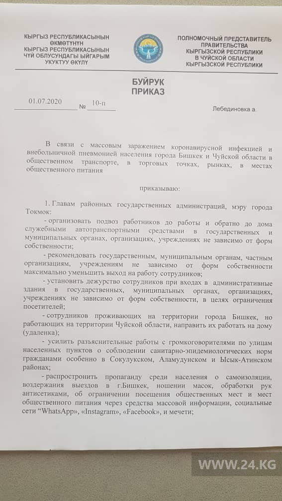 Свое решение полпредство объясняет массовым заражением коронавирусом и внебольничной пневмонией жителей Бишкека и Чуйской области на рынках, в торговых точках, местах общественного питания и общественном транспорте.
