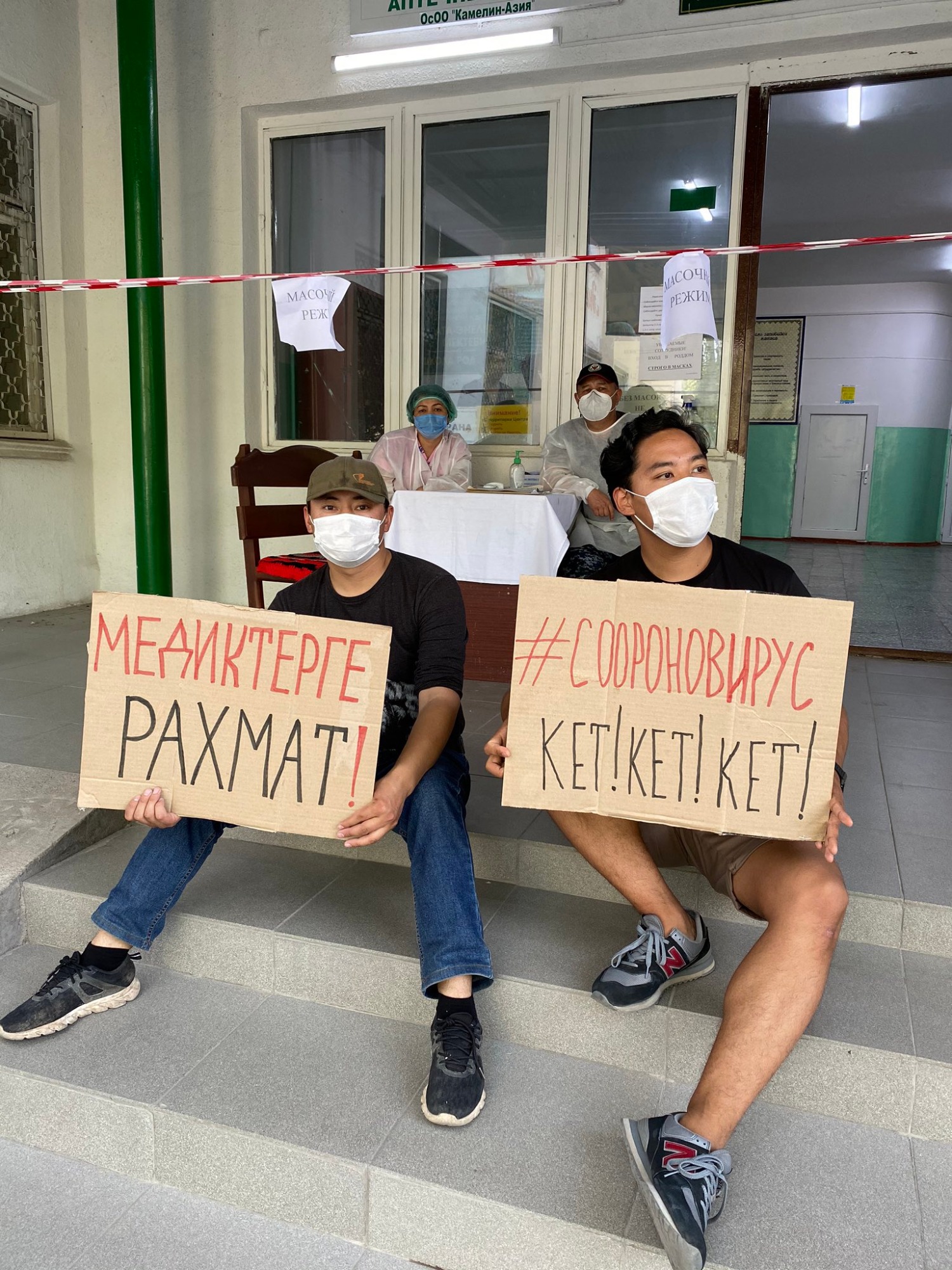 В центре Бишкека два молодых человека провели флешмоб. Они стояли с плакатами и благодарили врачей за их нелегкий труд в борьбе с коронавирусом. Об этом на своей странице в социальной сети Instagram сообщил активист Улан Усейин.