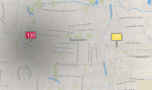 - в районе улиц Бейшеналиевой/Токтогула. Уровень загрязнения превышен в 2,1 раза: PM2.5 среднесуточный — 74 мкг/м³, на момент измерения — 135 мкг/м³;