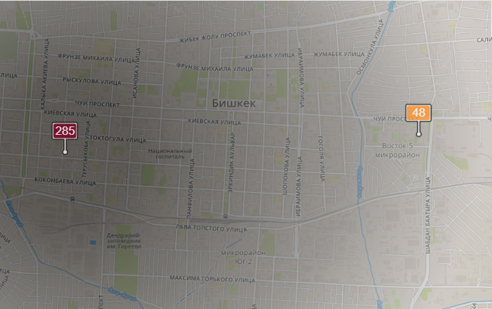 - в районе улиц Московской/Уметалиева. Уровень загрязнения превышен в 5,13 раза: PM2.5 среднесуточный — 186 мкг/м³, на момент измерения — 285 мкг/м³;