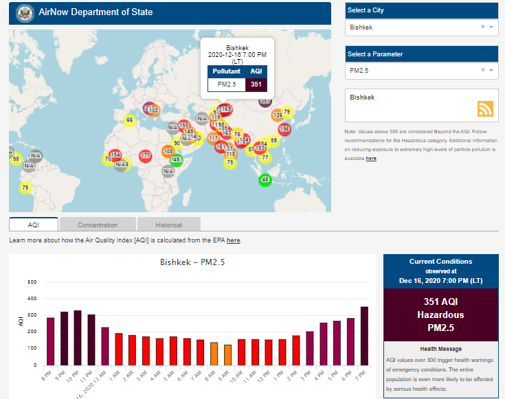 Посольство США в Кыргызстане также установило датчик. Он показывает индекс качества воздуха в режиме онлайн. Информация обновляется ежечасно.