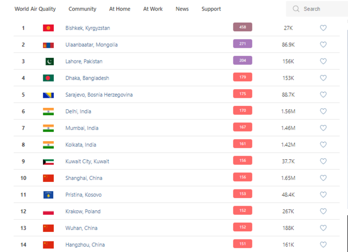 В рейтинге крупнейших городов мира по качеству воздуха World Air Quality Бишкек на 19.30 снова находится на первом месте.