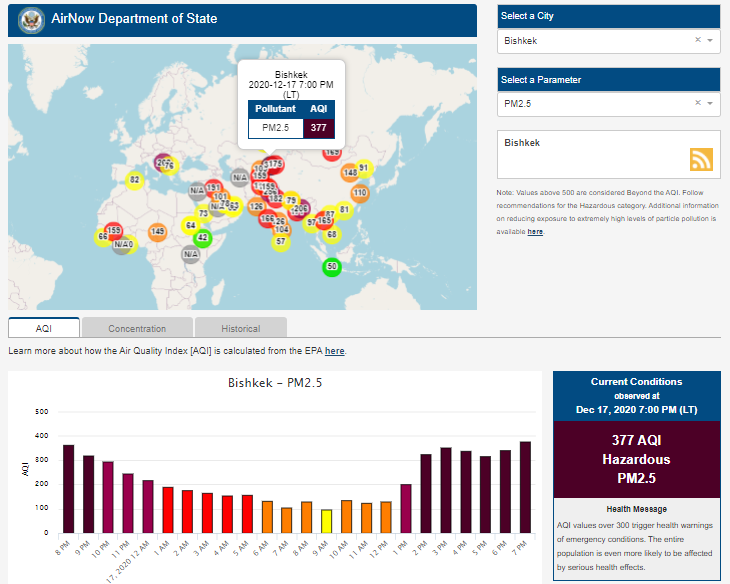 Посольство США в Кыргызстане также установило датчик. Он показывает индекс качества воздуха в режиме онлайн. Информация обновляется ежечасно.
