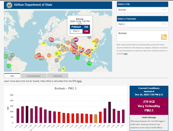 Посольство США в Кыргызстане также установило датчик. Он показывает индекс качества воздуха в режиме онлайн. Информация обновляется ежечасно.