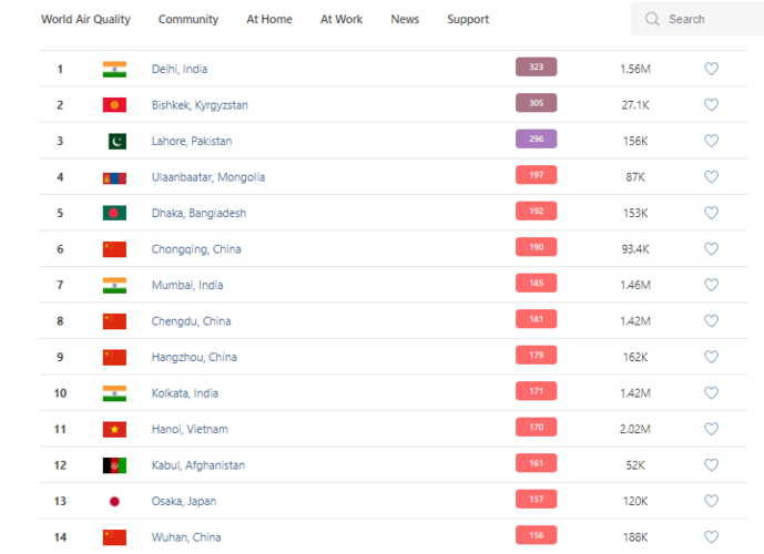 В рейтинге крупнейших городов мира по качеству воздуха World Air Quality Бишкек на 19.30 поднялся на второе место.