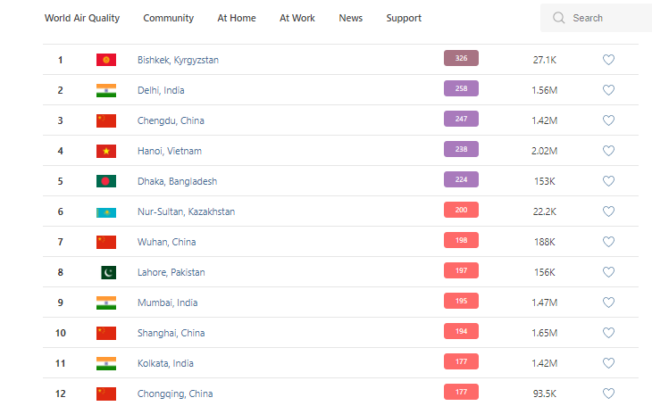 В рейтинге крупнейших городов мира по качеству воздуха World Air Quality Бишкек на 19.30 находится на первом месте.