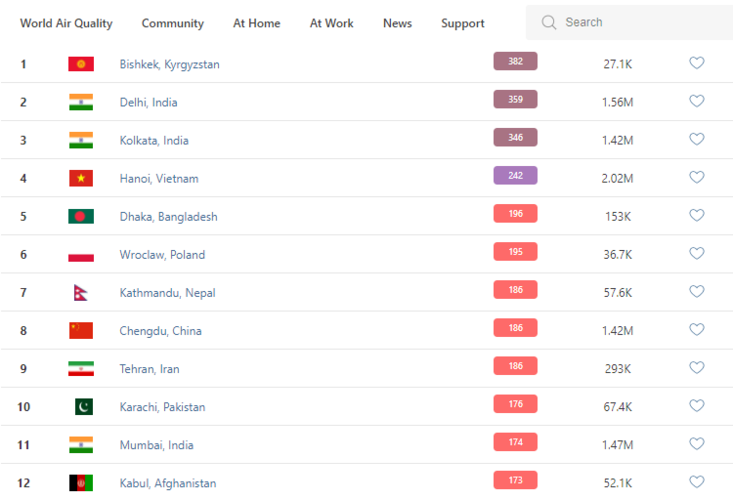 В рейтинге крупнейших городов мира по качеству воздуха World Air Quality Бишкек опять находится на первом месте.