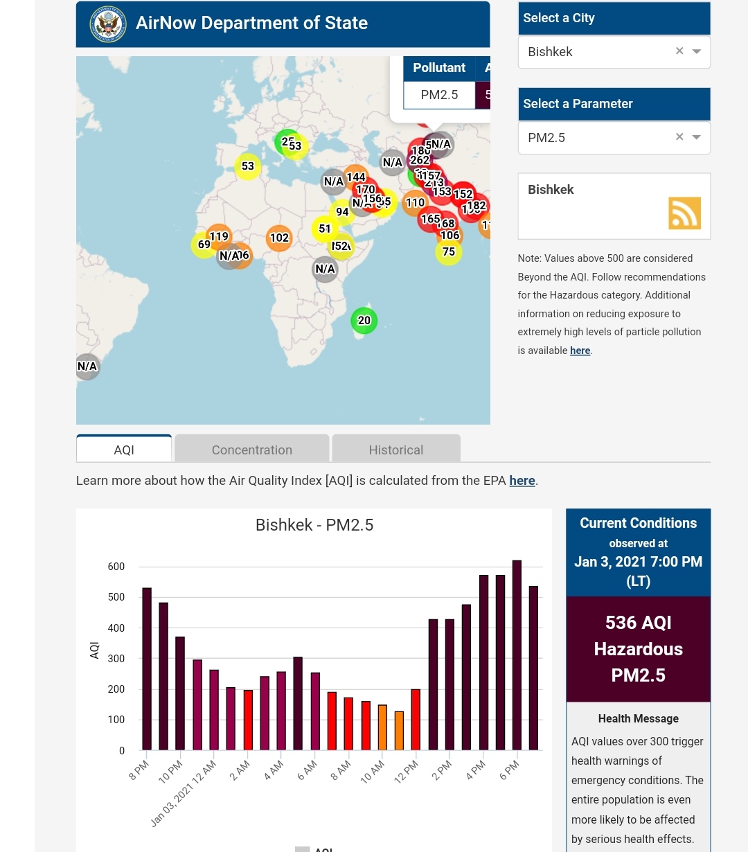 В 19.30 статус города отмечен как «опасно» (Hazardous). Индекс качества воздуха, по данным сайта, составляет 438 (AQI).