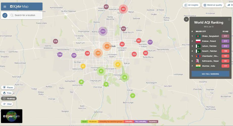 В рейтинге крупнейших городов мира по качеству воздуха World Air Quality Бишкек опустился на 22-е место.
