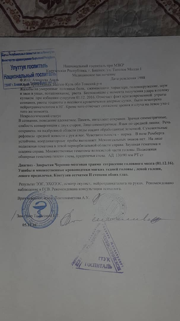 «После этого Асель с детьми уехала в Москву к своей матери, устроила двух старших в школу. Они жили с ней ровно год. Вскоре встал вопрос о получении паспортов, для этого нужно было разрешение отца. Бакыт требовал, чтобы она вернула детей. Она привезла их для оформления документов, и с тех пор он не отдает детей, ссылаясь на то, что они должны расти у себя на родине, дома. Бывшая свекровь тоже вмешивается и не желает отдавать внуков, просит Асель оставить их всех в покое», — подчеркивает адвокат.Пострадавшая от рук мужа решилась и подала в суд на бывшего супруга, требуя вернуть детей. Однако Тонский районный суд Иссык-Кульской области постановил оставить детей с отцом в селе Каджи-Сай, потому что им привычнее жить там. Переезд в Москву, как считает суд, может негативно отразиться на психоэмоциональном состоянии несовершеннолетних.