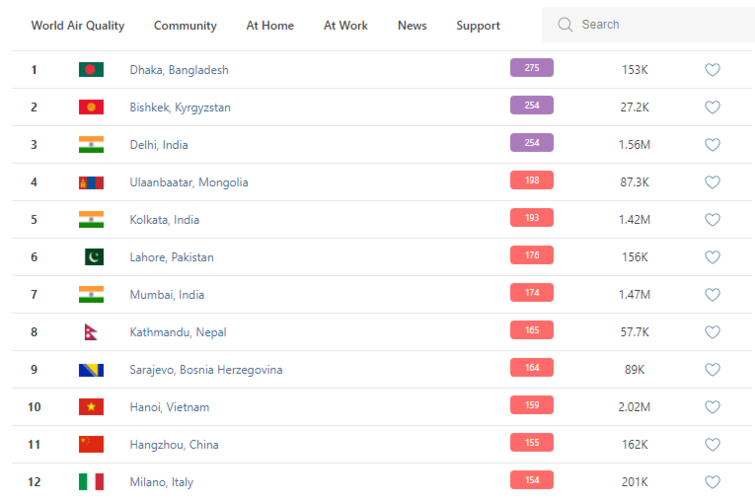 В рейтинге крупнейших городов мира по качеству воздуха World Air Quality Бишкек поднялся на второе место.