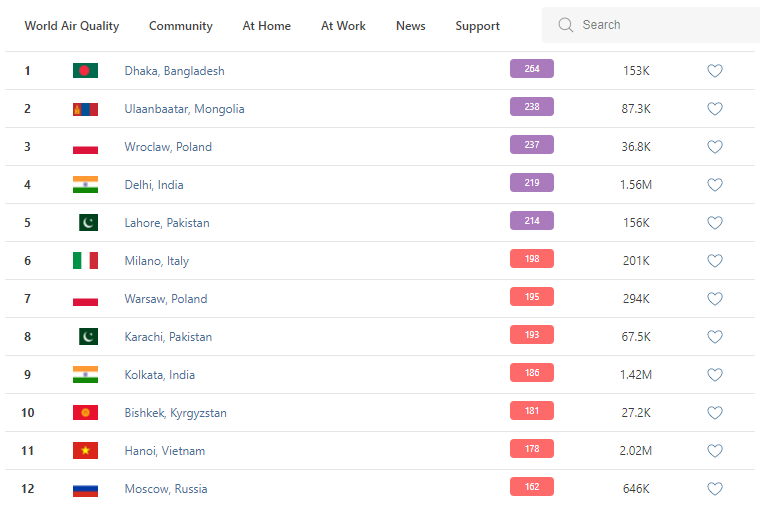 В рейтинге крупнейших городов мира по качеству воздуха World Air Quality Бишкек поднялся на 10-е место.